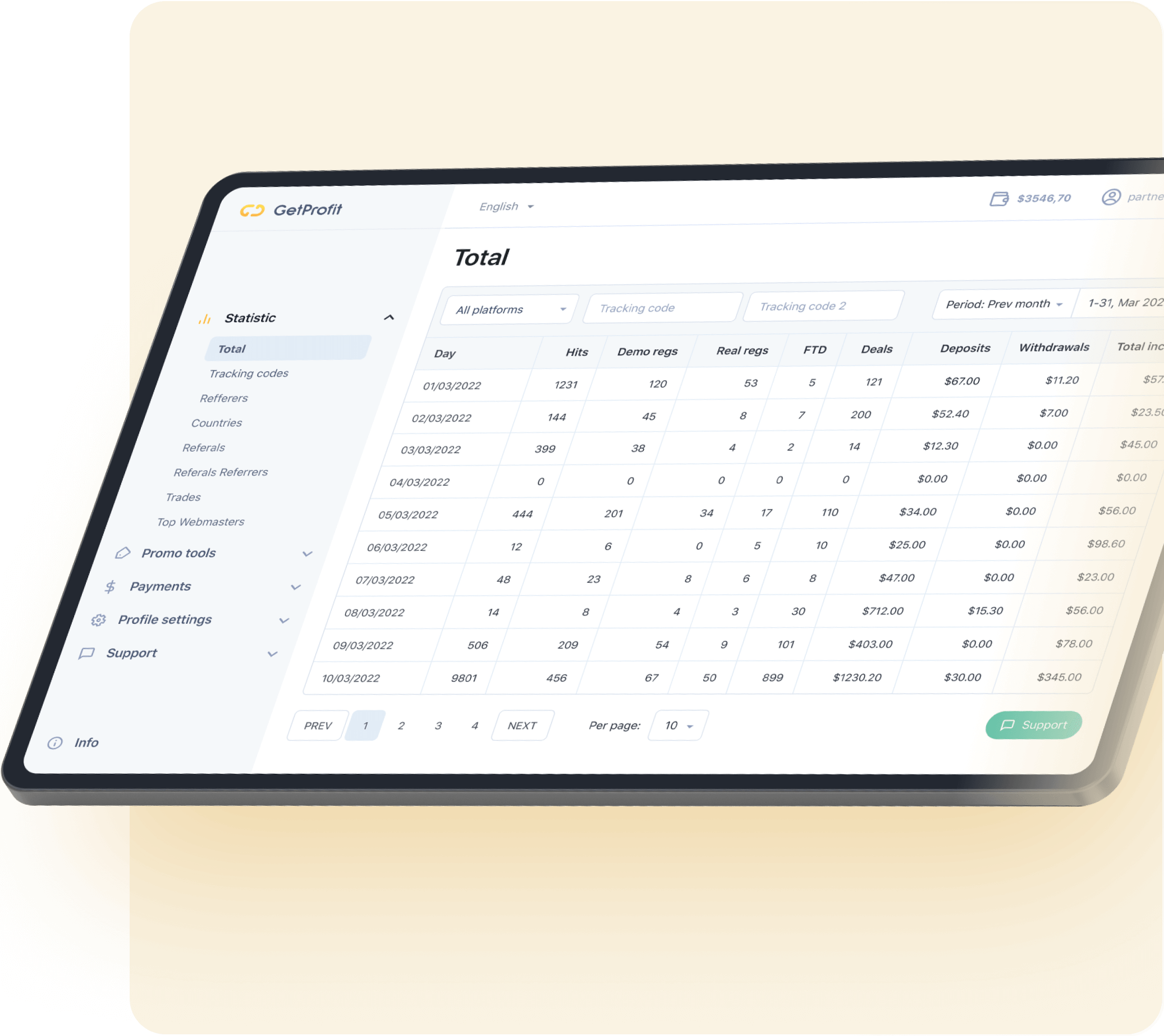 Convenient dashboard for traffic analytics by country, device and other tags.